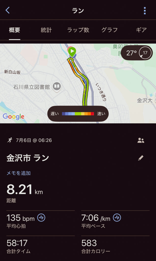 第1回の今回は6時に集合して、オリエンテーションや参加者同士の自己紹介のあと、浅野川沿いの周回コースで足慣らしをしました。みなさんどれくらい走れるのか心配していたんですが、フルマラソン未経験者のみなさんも飄々と走っていてビックリ。これは本番も期待が持てそうです!